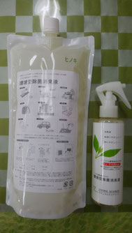 「環境型除菌液」は、樹木の中でも特に除菌作用の高い、ヒバ、ヒノキ、サワラなどの精油を主に配合。